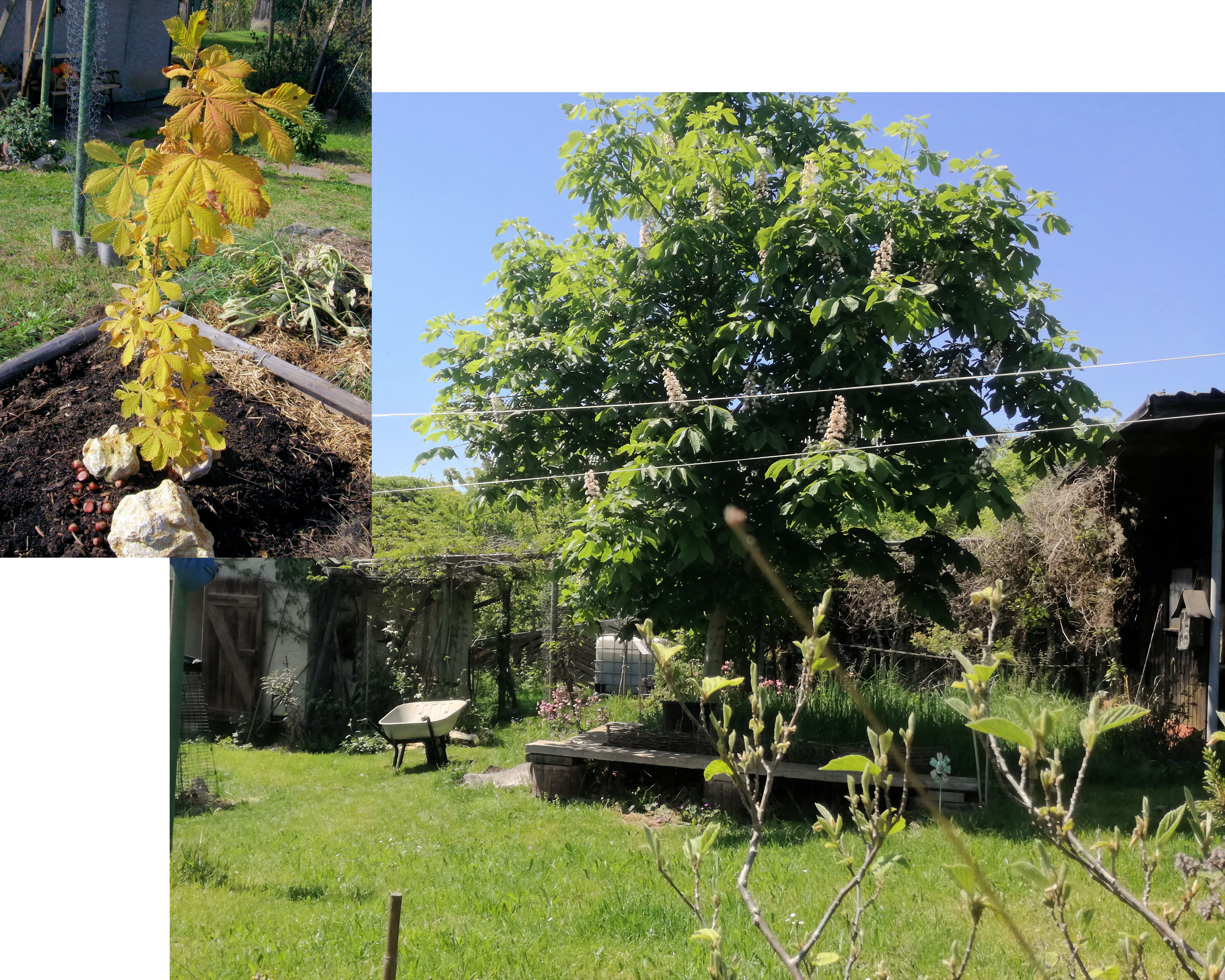 Oben siehst Du eine Kastanie 2013: klein, ca 100 cm, ein paar Verzweigungen. Daneben 2020: groß, ca 5 m hoch - komm doch zum Zählen der Zweige vorbei! Oder komm in knapp 300 Jahren: Dann ist sie altersbedingt umgekippt – ganz wörtlich: sie hat einen irreversiblen Kipppunkt erreicht - diese Kastanie wird dann nie wieder hier stehen.